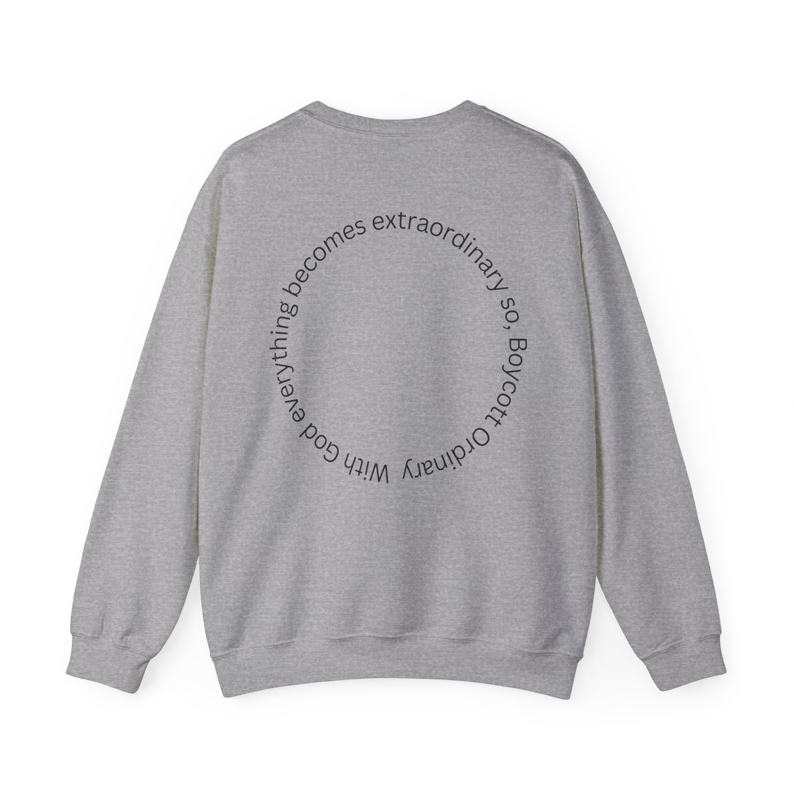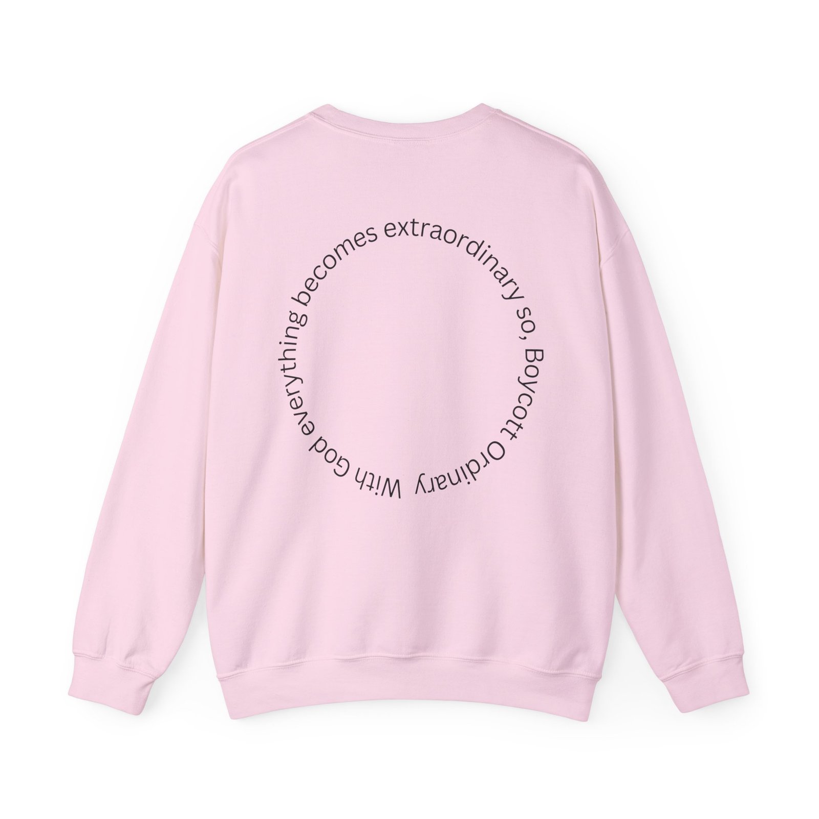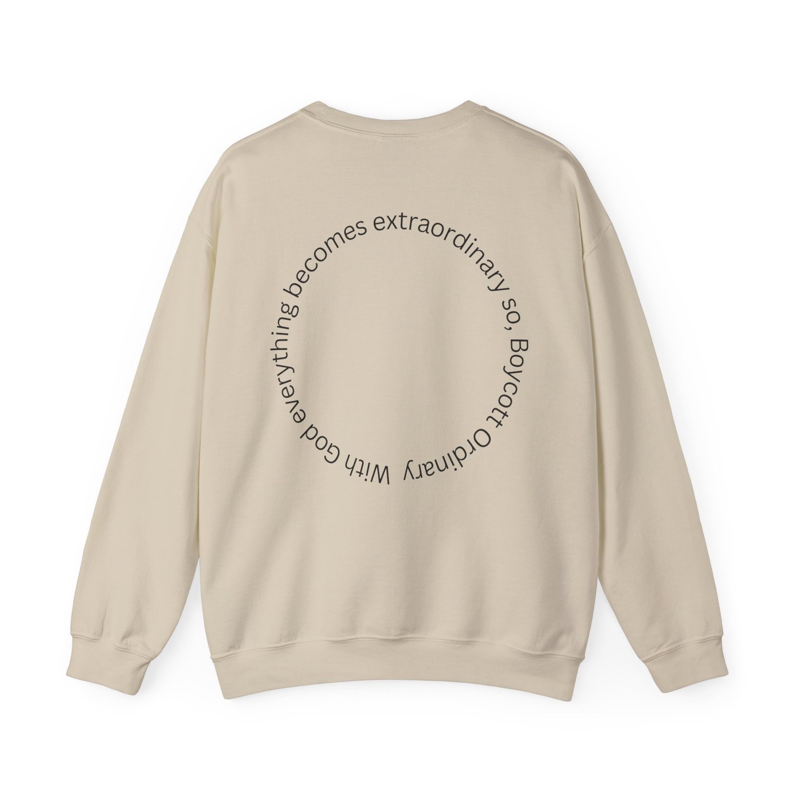 A clean, softly structured crewneck sweatshirt with thoughtful minimalist graphics that read as a quiet statement. The front features a subtle, elegant logotype while the back carries a circular phrase that invites a second look. Midweight and gently roomy, it feels like a familiar layer you reach for on cooler mornings — easy to wear at home, on walks, or layered under a coat. The neutral white keeps the focus on the thoughtful typography and makes the message feel understated rather than loud. Crafted with durable stitching and eco-conscious materials, this sweatshirt ages well and keeps its shape through regular wear.